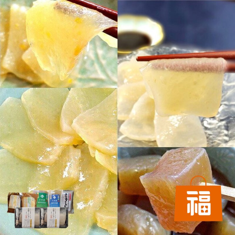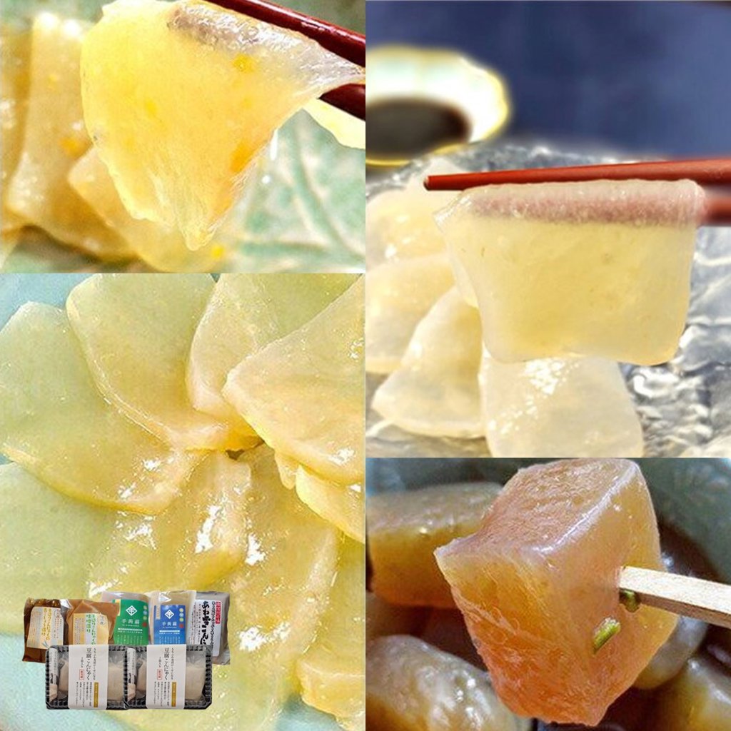定番のこんにゃく芋100%の手造り蒟蒻に、柚子の皮・高野豆腐を練り込んだ新食感の蒟蒻(250g×3袋)、またあわ雪こんにゃくをより濃厚にクリーミーに進化させた豆腐こんにゃく(240g×2パック)、味漬けした蒟蒻2種(240g×2)を詰め込んだセットになります。